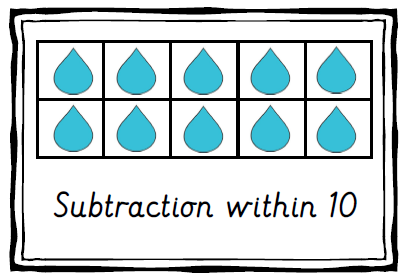 Maths subtraction under 10 cards with filled tens frames and number sentences to complete. If laminated, you can cross out the raindrops and answers can be written in the bucket with white board pens and rubbed off. You can also use counters or other maths manipulatives to work out answers.
